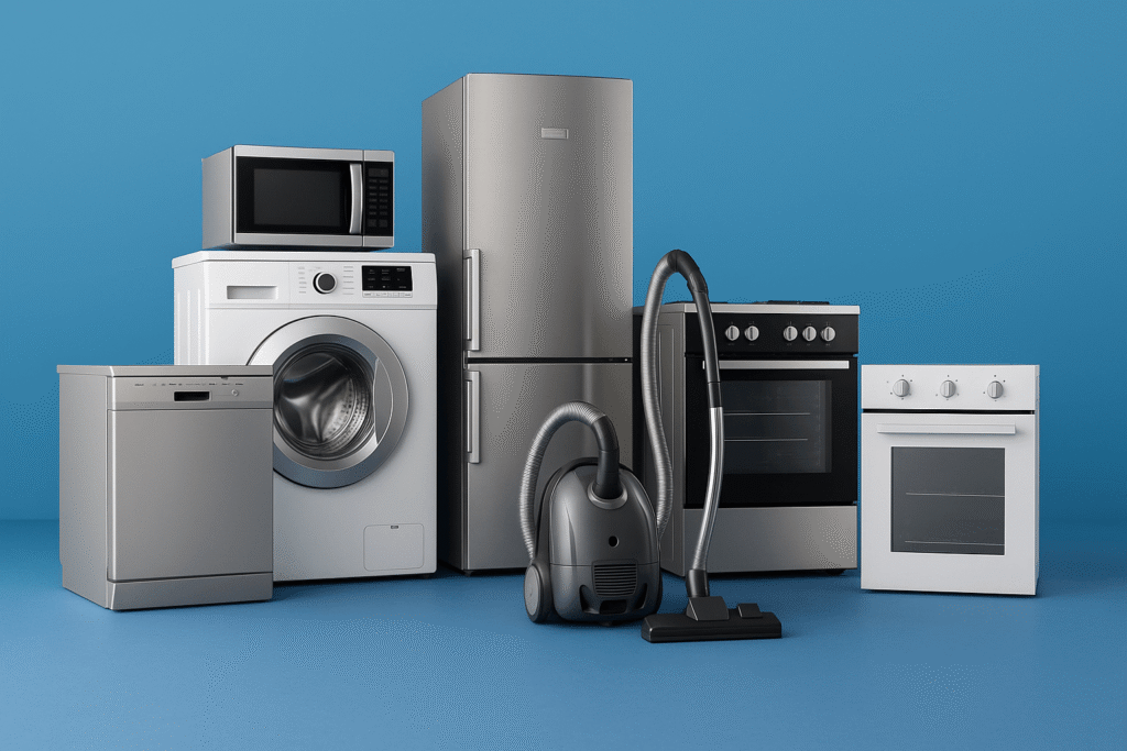 1. المراوح الكهربائية سقف، طاولة، جدارية، أرضية، شفط، منقولة… إلخ 2. الثلاجات والفريزرات بأنواعها المنزلية والتجارية 3. غسالات الملابس والمجففات 4. خلاطات ومفرمات ومطاحن وعصارات وأجهزة تحضير الطعام 5. المحمصات توست، ساندويتش، فرن توستر… 6. أجهزة العناية بالشعر والبشرة (سيشوار، مكواة شعر، أجهزة تمليس وتجعيد…) 7. أجهزة التدفئة الكهربائية (سخانات، دفايات، سخانات زيت، مشعات…) 8. أفران وميكروويف وأجهزة طبخ منزلية 9. سخانات المياه الكهربائية 10. المكاوي (بخار، جافة، مكابس، مكواة بخار ملابس…) 11. القوابس والمقابس والأسلاك والموصلات والشواحن 12. مكيفات الهواء المنزلية (بأنواعها المنفصلة والمركزية)